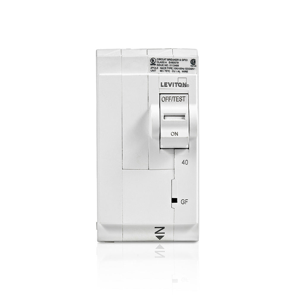 The Leviton LB240-GF is a GFCI branch circuit breaker designed for use in residential and commercial applications. This two-pole breaker supports 40 amps and operates at a voltage rating of 120/240 VAC. With a ten kA interrupt rating, it provides reliable protection against overcurrents. The hydraulic magnetic trip feature ensures precise operation even under extreme conditions.