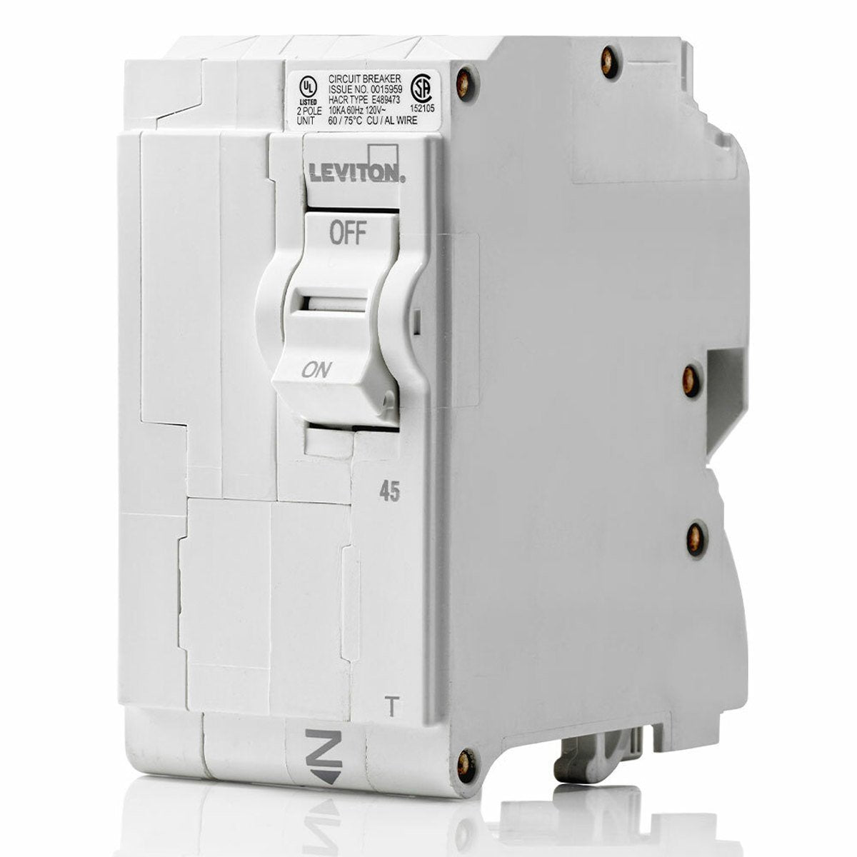 The Leviton LB245-T is a standard thermal magnetic branch circuit breaker rated for 120/240 VAC and 45 Amps. This breaker is designed to provide reliable protection in residential and commercial power distribution systems. With a ten kA interrupt rating, it effectively safeguards against overloads and short circuits.