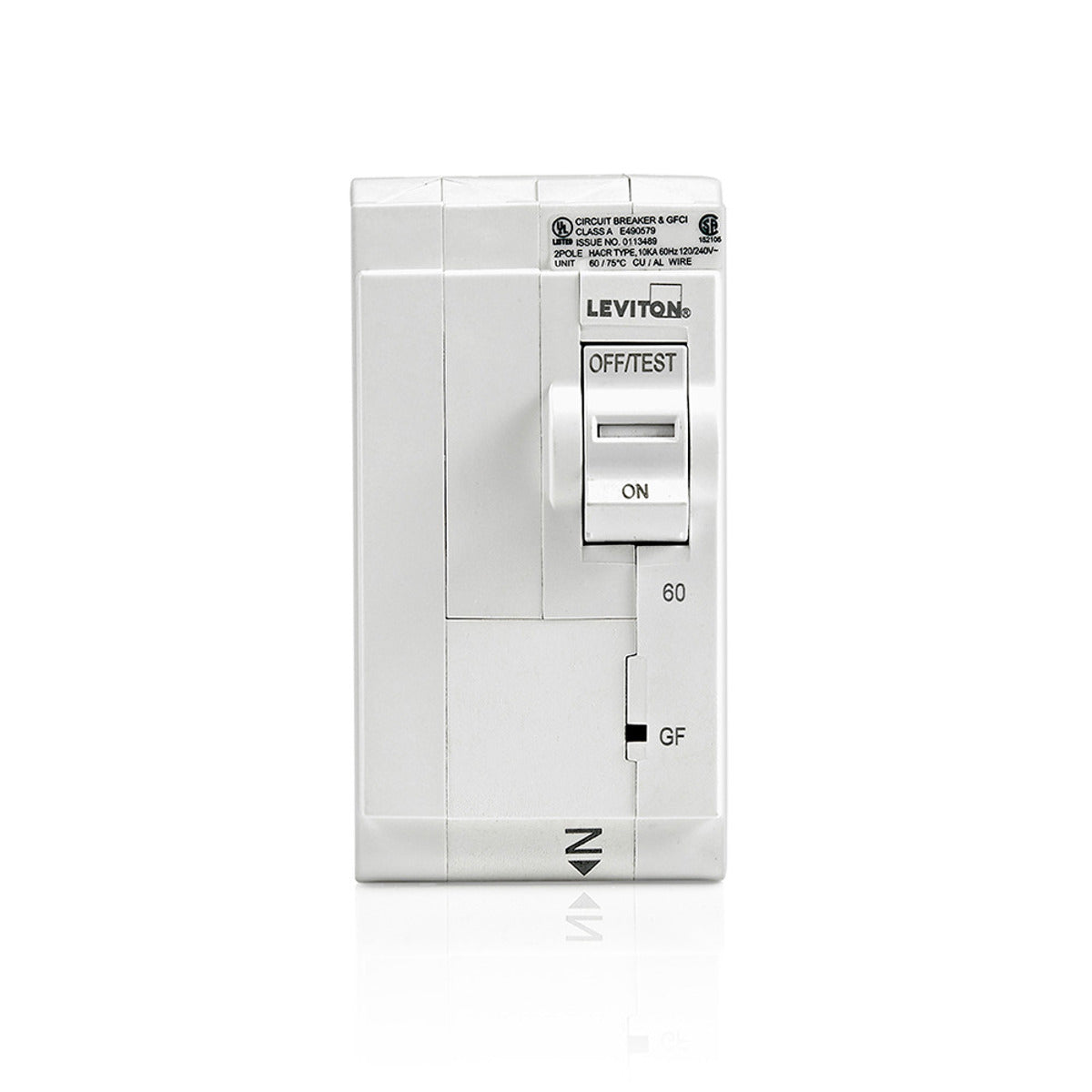 The Leviton LB260-G Ground Fault Hydraulic Magnetic Branch Circuit Breaker is designed for use in electrical systems with a voltage range of one hundred twenty/ two hundred eight volts and one hundred twenty/ two hundred forty volts. This circuit breaker operates at sixty amps and features an interrupt rating of ten kiloamperes. It is a two-pole breaker that provides reliable protection for various applications.