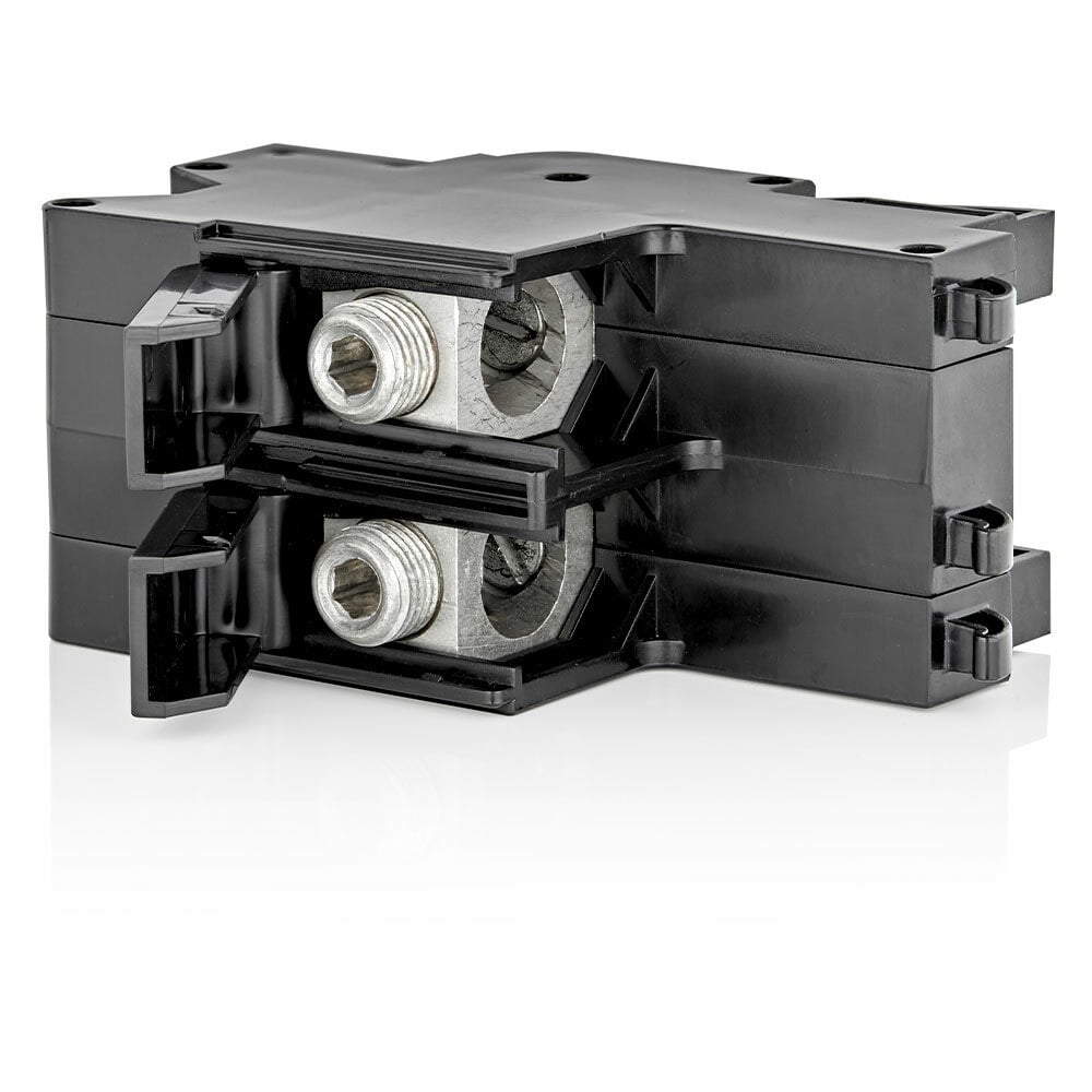 Leviton LFTLA Lug Accessory is designed for use with load centers. This feed through lug accommodates conductors ranging from three AWG to three hundred kcmil for both copper and aluminum. The plug-on mounting system simplifies installation, integrating easily into panels like a circuit breaker.