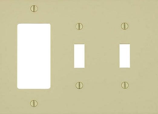 The Leviton PJ226-I is a combination wall plate designed for use with three gang setups, including two toggle switches and one Decora/GFCI outlet. It is crafted from durable thermoplastic material and has a midway size, measuring six and three-fourths inches wide by four and seven-eighths inches high. This wall plate is ideal for both residential and commercial applications.