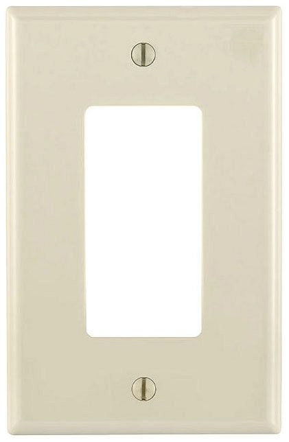 The Leviton PJ26-T is a 1-gang, 1-Decora midway nylon wallplate designed to cover larger-volume outlet boxes. This wallplate offers a clean appearance while effectively hiding wall imperfections. Ideal for residential and commercial applications, it features a smooth finish that resists dust accumulation and is compatible with Decora switches.