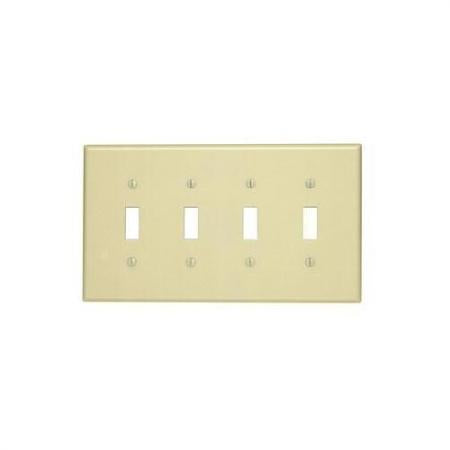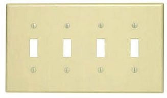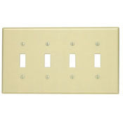 The Leviton PJ4-I 4-Gang Toggle Switch Wallplate is designed for use with toggle switches. This midway size wallplate fits standard toggle switches and provides a clean look for any installation. It is easy to install, making it suitable for both new and retrofit constructions.