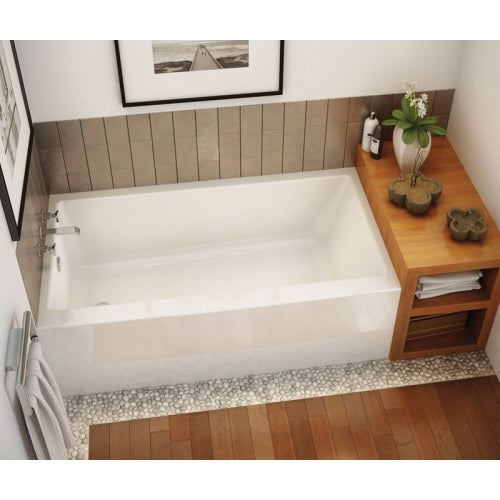 The tub incorporates a rectangular shape with a gently sloping backrest for added comfort. It has a capacity of fifty-nine gallons of water, perfect for a full-body soak. The acrylic material provides resistance to chipping and cracking, ensuring long-lasting use.