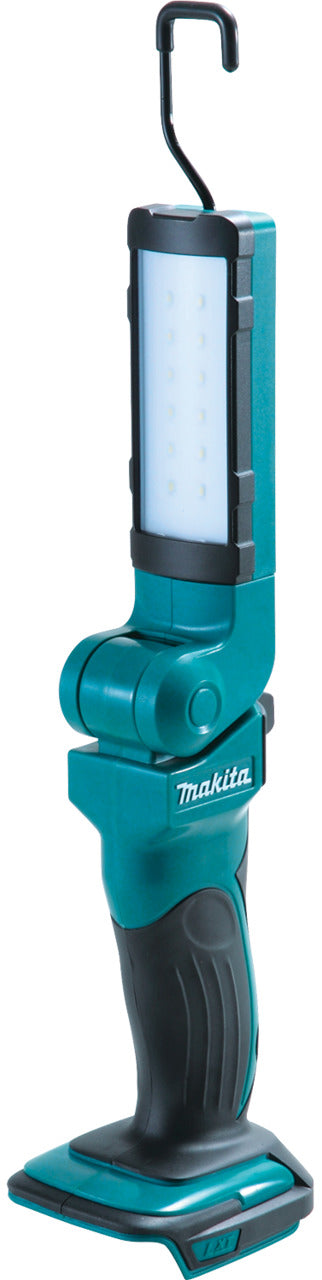 The Makita 18V LXT Lithium-Ion Cordless 12 LED Flashlight (model DML801) offers bright illumination and flexibility. This flashlight emits 240 lumens at full brightness from its twelve LED lights. It also has a half-brightness mode with six LEDs that provides 120 lumens. When paired with the fast-charging Makita 18V LXT Lithium-Ion 3.0Ah battery (not included), it operates for twelve hours in full brightness mode and up to twenty-two hours in half brightness mode. The flashlight is compatible with Makita 18V Lithium-Ion batteries and features a foldable head that pivots for different lighting angles. Additionally, a metal hook that rotates helps to hang the flashlight conveniently. At fifteen inches long and weighing only 2.1 pounds, it is designed for ease of use. It is part of Makita's renowned 18V Lithium-Ion series, known for fast charging and reliable performance.