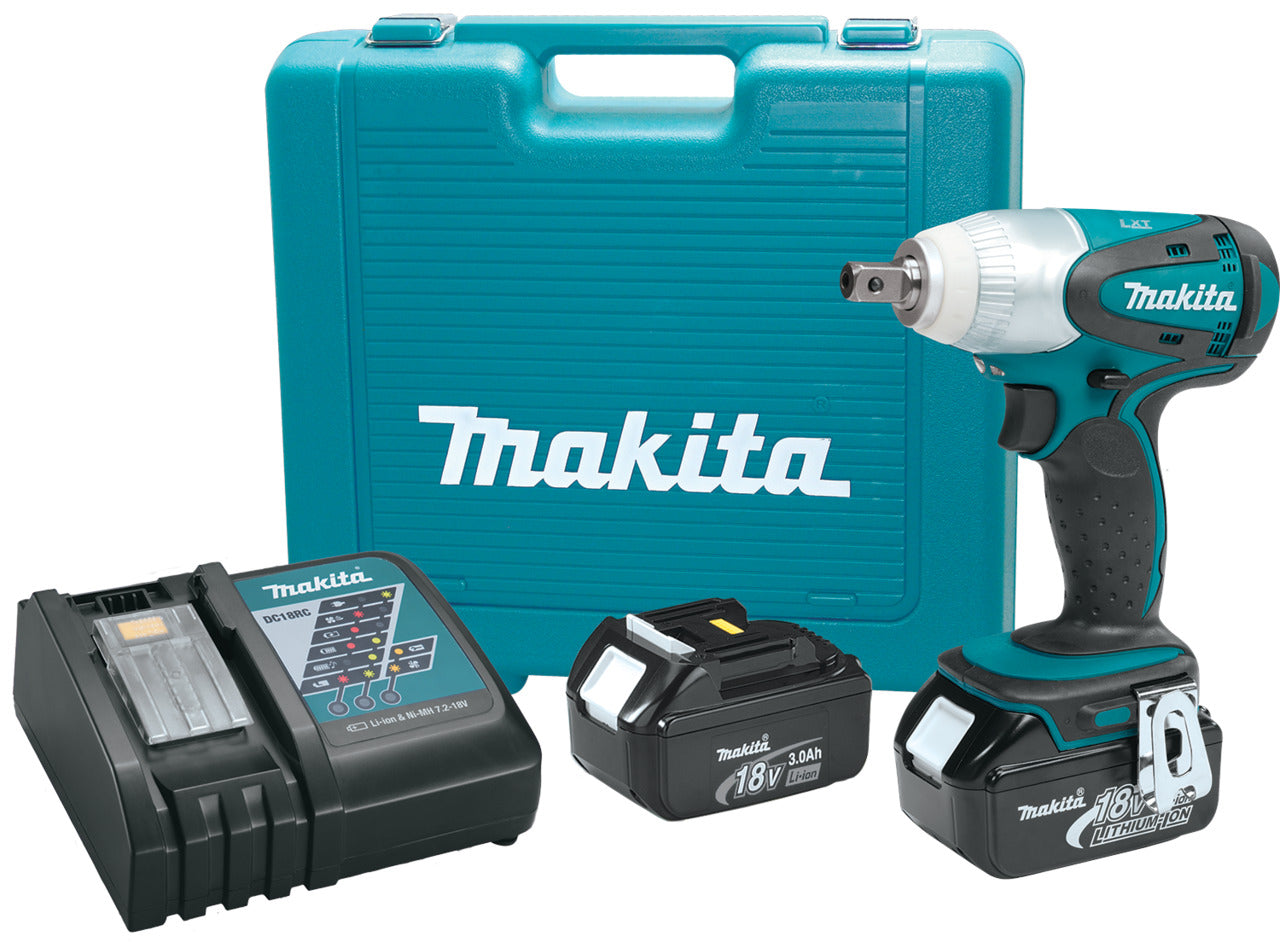 The Makita XWT05 is an 18V LXT Lithium-Ion Cordless 1/2 Square Drive Impact Wrench Kit designed for professional use. It features a powerful Makita-built 4-pole motor that delivers 170 foot-pounds of maximum torque. This wrench operates at variable speeds up to 2,100 RPM and provides up to 3,200 impacts per minute, making it ideal for a wide range of fastening tasks.