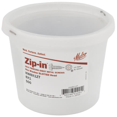 The Malco HW8X1ZT Zip-in® screw is designed for fast and efficient fastening in metal applications. This self-drilling screw features a hex washer head suitable for various tasks. The pack contains five hundred screws, making it ideal for larger projects.