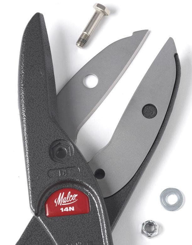 The Malco MC14N Combination Snip is designed for efficient cutting tasks in various materials. This tool features a carbon steel blade with an aluminum frame, measuring fourteen inches in overall length. It is ideal for HVAC tasks and can cut through materials such as vinyl, aluminum, and mild steel.