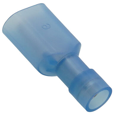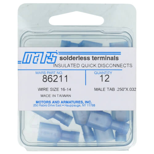 The Mars 86211 is an insulated quick disconnect male tab designed for 16 to 14 American Wire Gauge conductors. The stud size is one-quarter inch, and it can withstand a temperature rating of one hundred five degrees Celsius. This product is suitable for various electrical and HVAC applications where reliable connections are necessary.