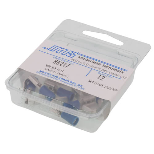 The Mars brand 86217 Solderless Terminal is designed for quick disconnect applications. It is suitable for use with conductors sized 16-14 American Wire Gauge and fits a 1/4 inch stud. This terminal allows for easy connections and disconnections in electrical wiring systems.