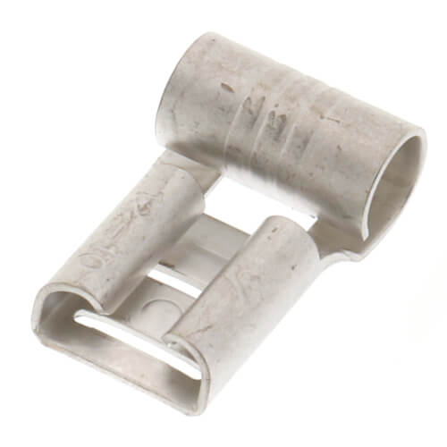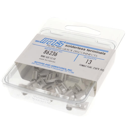The MARS 86236 terminal is a quick disconnect non-insulated female flag terminal. It is designed for use with conductors sized between twelve and ten American Wire Gauge (AWG), and features a stud size of one quarter inch. This connector is ideal for various electrical applications requiring a robust and reliable connection.