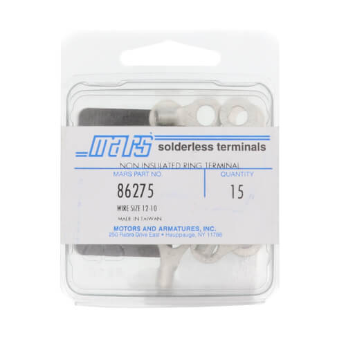 The Mars 86275 ring terminal is designed for efficient electrical connection with a non-insulated design suitable for twelve to ten American Wire Gauge (AWG) conductors and a No 10 stud. It operates at a maximum temperature of one hundred forty-nine degrees Celsius. It features a 13/64 inch inner diameter, ensuring a secure fit for your wiring needs.