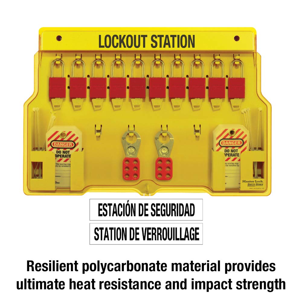 The Master Lock 1483BP1106 is designed for comprehensive OSHA-compliant lockout tagout programs. It helps secure up to 10 padlocks and is built to last with durable materials. The station includes all necessary components for effective lockout tagout procedures.