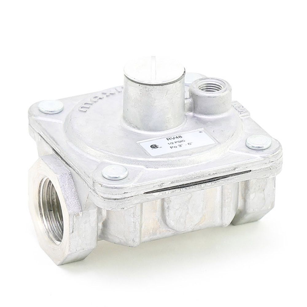 This Maxitrol gas regulator (RV48-3/4) maintains stable pressure regardless of fluctuating inlet pressure or flow rate. It features a 3/4 inch NPT outlet and can handle a maximum inlet pressure of 1/2 psi. The regulator is crafted from durable materials for long-lasting operation, making it suitable for various gas distribution systems.