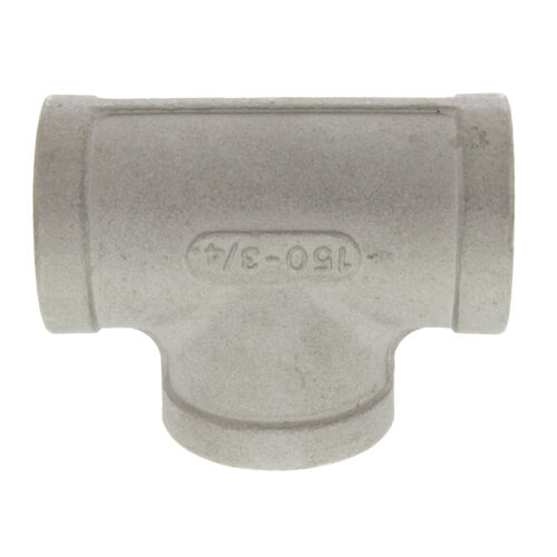 The Merit Brass K406-12 Banded Pipe Tee is a connector designed for plumbing applications. This pipe tee has a nominal size of three-fourths of an inch and features female NPT connections. It is made from 304/304L stainless steel. The component is rated for a pressure class of 150 lb and a temperature up to one hundred degrees Fahrenheit. Its outer diameter measures one point thirty-eight inches, making it suitable for various plumbing setups.