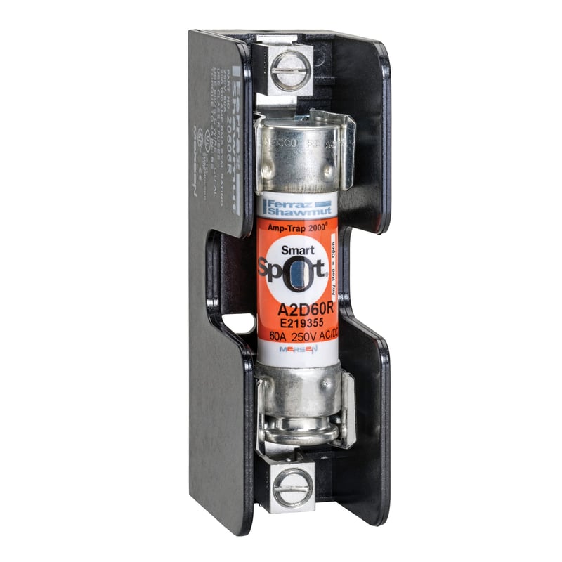 The Mersen 20606R is designed to provide reliable circuit protection with a rating of sixty amps and two hundred fifty volts. This one-pole fuse block is suitable for use in various electrical systems where fuse protection is required. It features a reinforced clip for secure installation and connection.