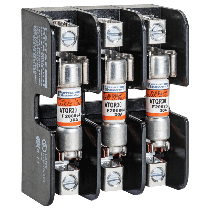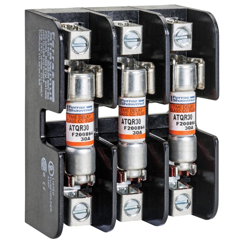 The Mersen 30313R is a fuse block designed for use with 30 amp, 600 volt applications. This fuse block features a three-pole configuration and meets Class CC standards. It is suitable for installations requiring reliable protection and easy connectivity.