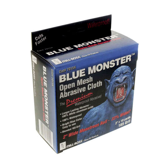 The Mill-Rose 70154 Blue Monster Abrasive Cloth is a 2 inch x 10 yard roll made of 165 grit aluminum oxide. This abrasive cloth is suitable for a range of sanding applications, offering effective removal of material and surface preparation.