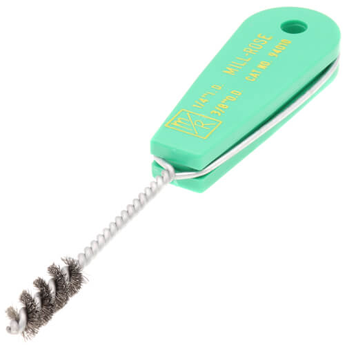 The Mill-Rose 94010 Refrigeration Brush is designed for effective cleaning in plumbing and refrigeration applications. This brush has a diameter of three-eighths inches and features single spiral crimped wire for strength. It is suitable for purging and cleaning copper fittings and pipes. The sturdy construction of this brush makes it a reliable choice for HVAC technicians and plumbers.