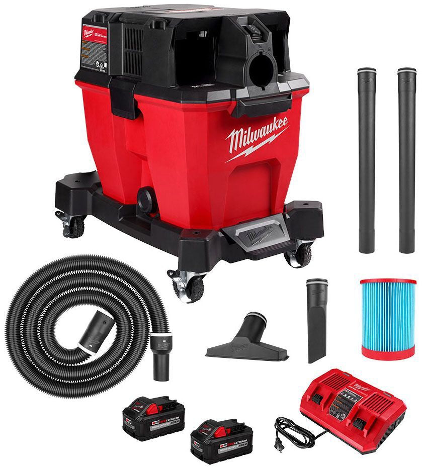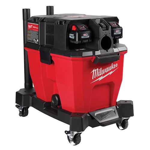 The Milwaukee M18 FUEL 9 Gallon Dual-Battery Wet/Dry Vacuum Kit, MPN 0920-22HD, is designed for effective jobsite cleanup. The vacuum outperforms traditional 4.25 peak horsepower wet/dry vacuums by delivering consistent cleaning power through a POWERSTATE brushless motor. This vacuum is powered by two M18 REDLITHIUM batteries, allowing operators to efficiently clean drywall dust, concrete dust, and metal shavings.