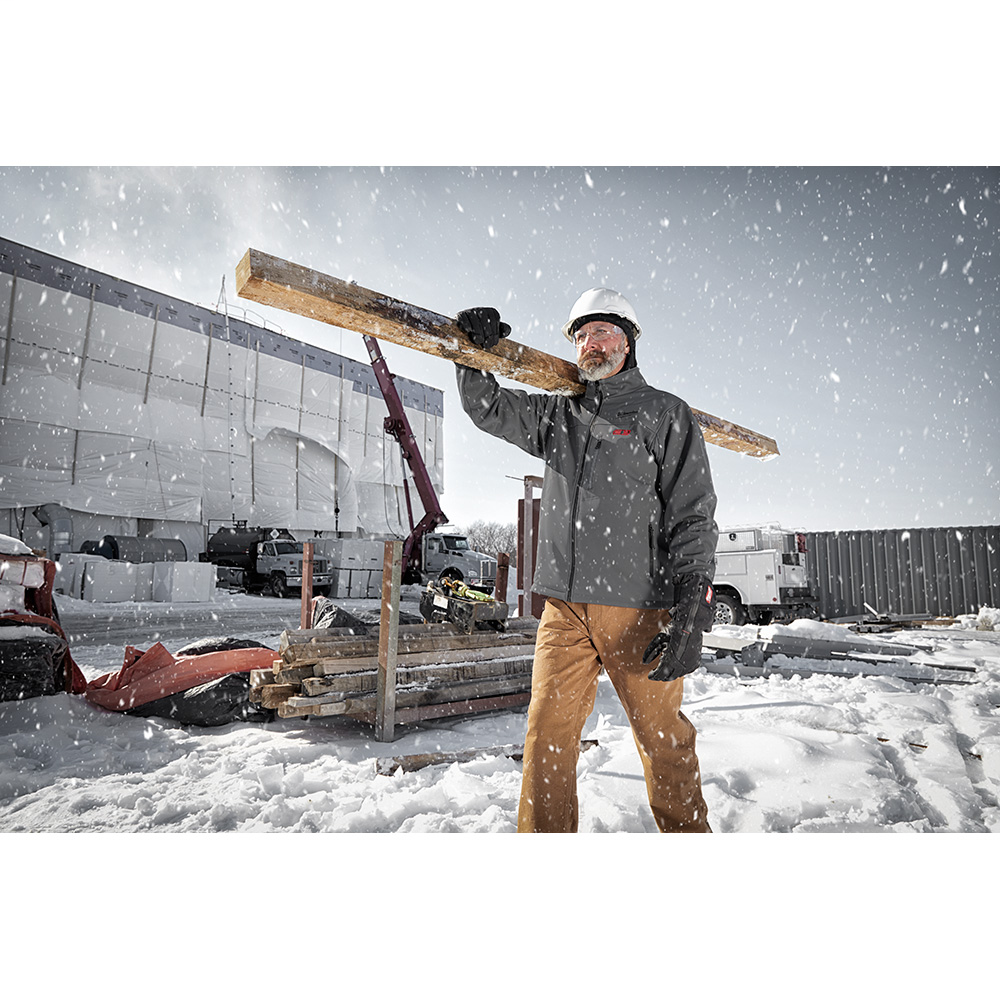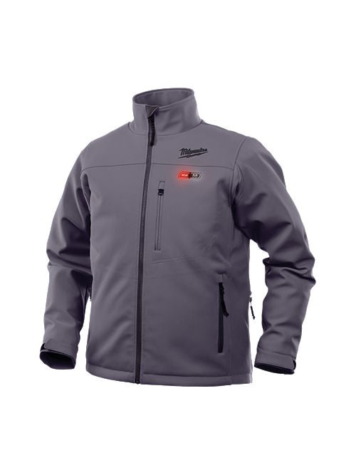 The Milwaukee M12 Heated ToughShell Jacket Kit, MPN 202G-21XL, is designed for warmth and durability. It is powered by M12 REDLITHIUM batteries and features carbon fiber heating elements for effective heat distribution. This heated jacket includes a one-touch LED controller to adjust to three heat settings.