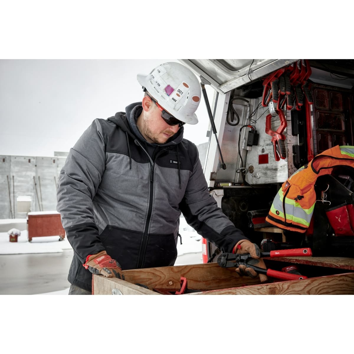 The Milwaukee M12 Heated AXIS Jacket, part number 205G-212X, offers robust heat management. This jacket integrates advanced heating technology powered by M12 REDLITHIUM battery, featuring carbon fiber heating elements for quick and effective warmth distribution. The design includes a three-panel hood and multiple heating zones, effectively targeting the chest, back, and shoulders for enhanced comfort during outdoor activities.