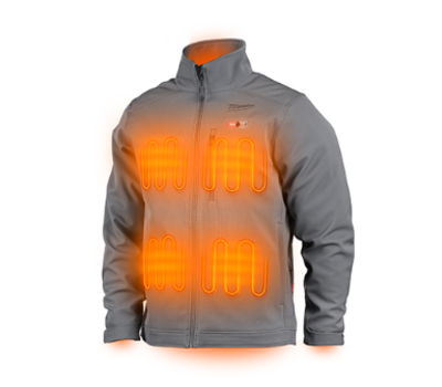 The Milwaukee M12 Heated AXIS Jacket, model 205G-21L, provides warmth and comfort. This heated jacket is powered by Milwaukee's 12 Volt REDLITHIUM Battery Technology. It features a three-panel hood and advanced heat technology using carbon fiber heating elements. The jacket distributes heat to the chest, back, and shoulders three times faster than competitors. A hidden battery pass-thru pocket allows for versatile battery placement.
