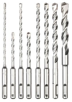 The Milwaukee Tool 48-20-7673 includes eight SDS Plus M/2 drill bits. These bits are designed for improved performance in drilling concrete. With a unique two-cutter design, they offer faster penetration and reduced drilling time.