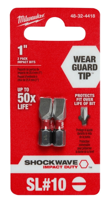 The Milwaukee 48-32-4418 Shockwave Impact Duty driver bits are built for exceptional durability and a longer lifespan. Made from proprietary steel and heat-treated for hardness control, these slotted insert bits are designed to tackle tough jobs with ease. The innovative geometric shock absorption zone ensures an extended life and the forged tip provides a secure grip, eliminating stripping or slipping.