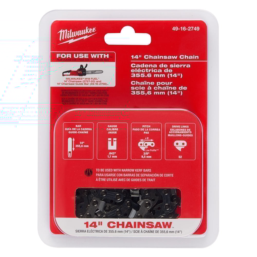 The Milwaukee 14 Chainsaw Chain is designed for use with the Milwaukee M18 FUEL 14 Chainsaw (model 2727-20C) and the 14 Chainsaw Guide Bar (part number 49-16-2756). This chain is engineered to provide fast cutting performance while minimizing vibration and kickback for safety and efficiency.