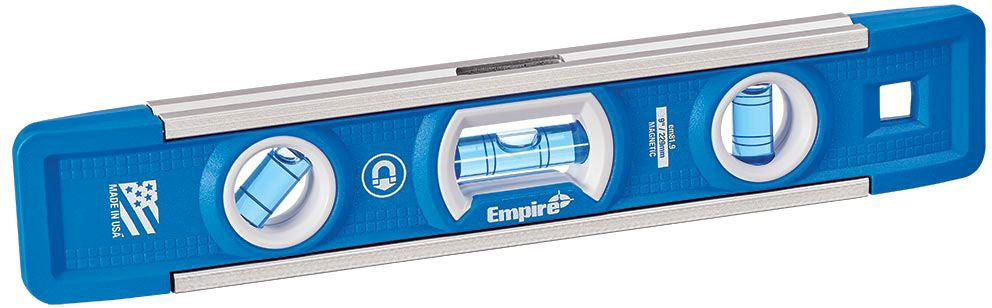 The Milwaukee EM81.9 is a nine-inch magnetic torpedo level designed for precise leveling tasks. This tool features True Blue vials, which provide accuracy to within 0.0005 inches per inch in all working positions. Constructed with a robust aluminum frame, the level is equipped with a top-read window for easy visibility.