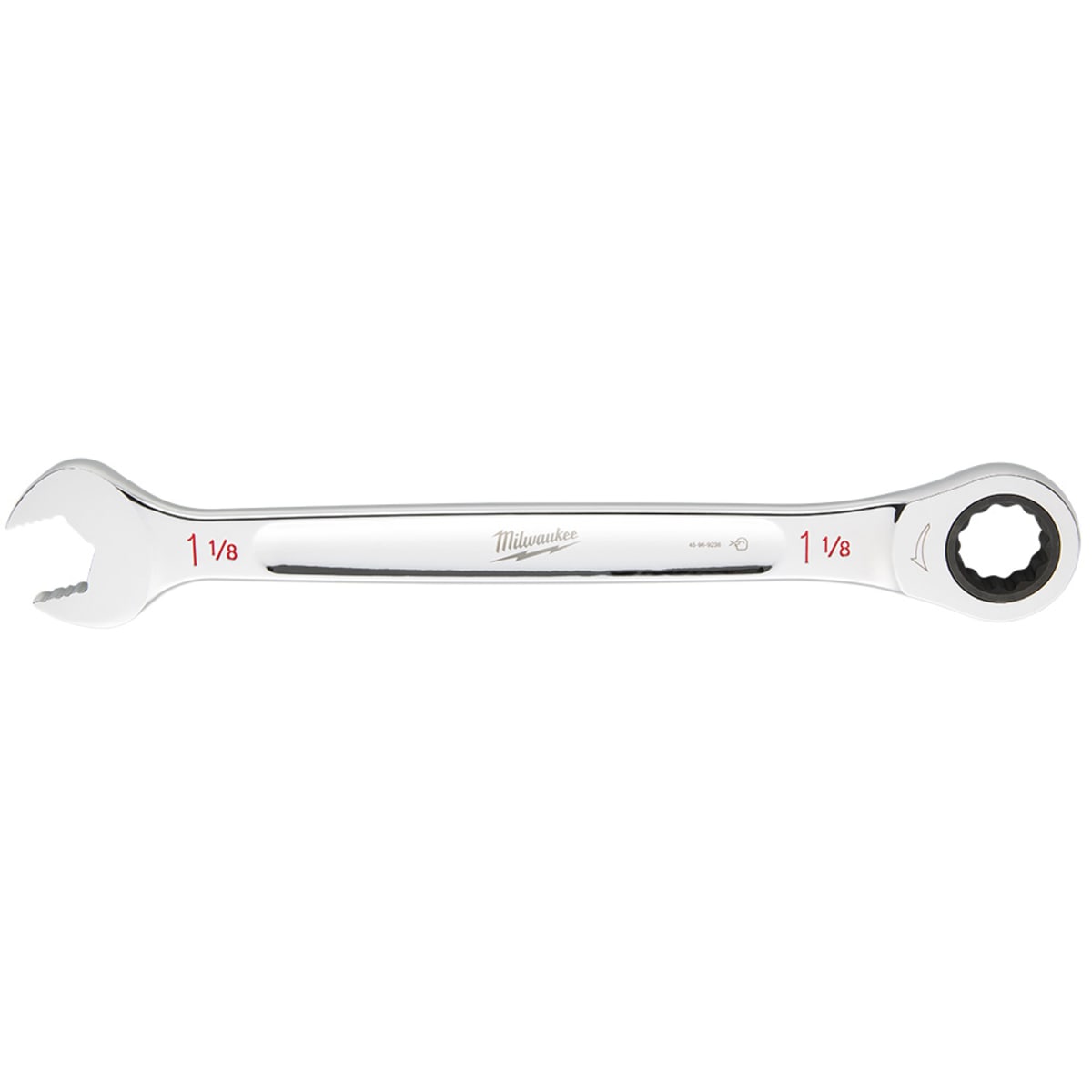 The Milwaukee Tool 45-96-9236 is a 1-1/8 inch ratcheting combination wrench designed for efficiency in tight spaces. It features a twenty-five percent increase in torque due to its MAXBITE open-end grip technology and has a unique double-stacked pawl design for improved durability.
