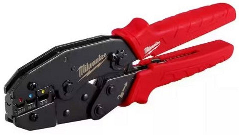 The Milwaukee Tool Ratcheting Insulated Terminals Crimper, MPN 48-22-3084, is designed for secure crimps on insulated wire terminals. Its ratcheting mechanism ensures a complete crimping cycle, providing high pull-off force. The tool features three distinct crimping cavities to accommodate various wire sizes: 22-18 AWG (red), 16-14 AWG (blue), and 12-10 AWG (yellow).