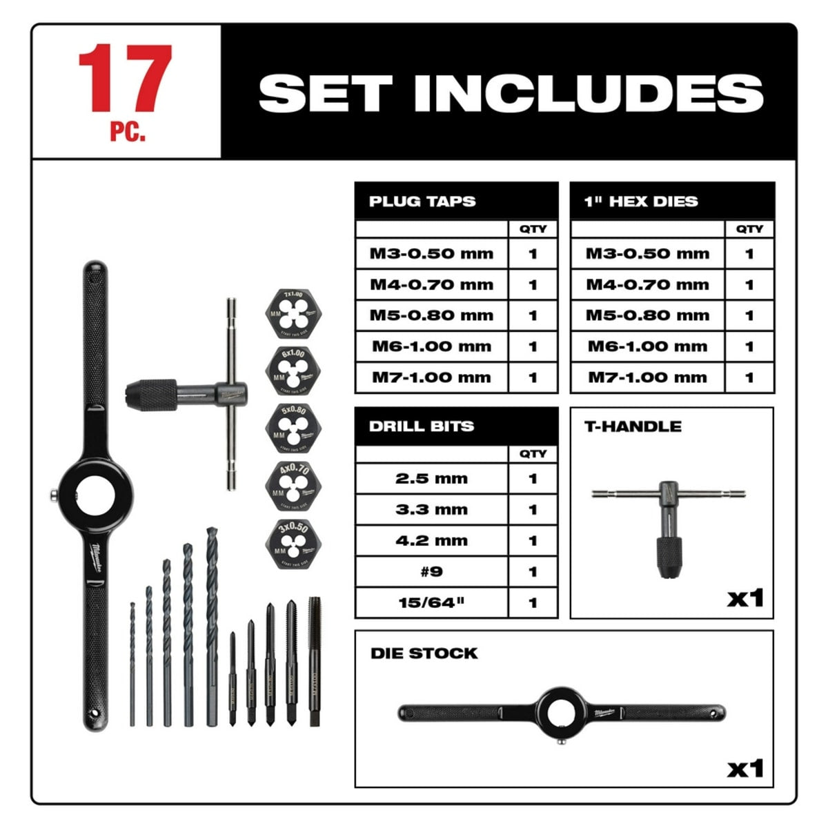 The Milwaukee Tool 49-22-5601 is a 17-piece metric tap and die set designed for threading applications. This set includes precision-machined threading tools and handles. Taps and dies are made from high carbon steel for durability. The clear markings on the tools are laser-etched for longevity, and the black oxide coating enhances corrosion resistance.