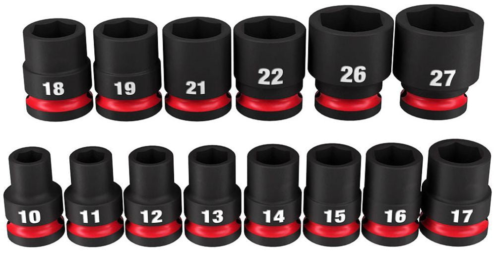 Included Socket Sizes: 10 mm, 11 mm, 12 mm, 13 mm, 14 mm, 15 mm, 16 mm, 17 mm, 18 mm, 19 mm, 21 mm, 22 mm, 26 mm, 27 mm