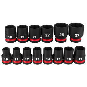Milwaukee Tool offers the 49-66-7013, a fourteen-piece 1/2 inch drive metric standard impact socket set. This set is designed for high torque applications. Each socket has stamped and ink-filled size markings for easy identification and selection. The impact durability of each piece is guaranteed through their strong design, making them suitable for heavy-duty tasks. The sockets are made from high-strength forged steel that can withstand tough jobs. A non-slip hex geometry prevents fastener rounding, and the dual-hole design allows for easy socket attachment and removal. The included case is impact-resistant and designed for easy storage and organization.
