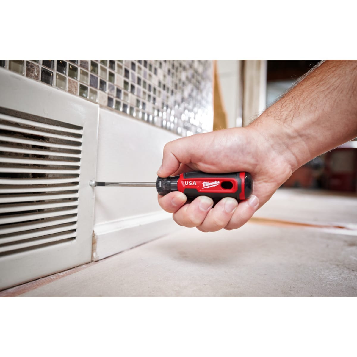 The Milwaukee Cushion Grip Screwdriver is made in the USA, offering durability and comfort for extended use. Quick identification markings aid in selecting the right screwdriver for the job at hand.