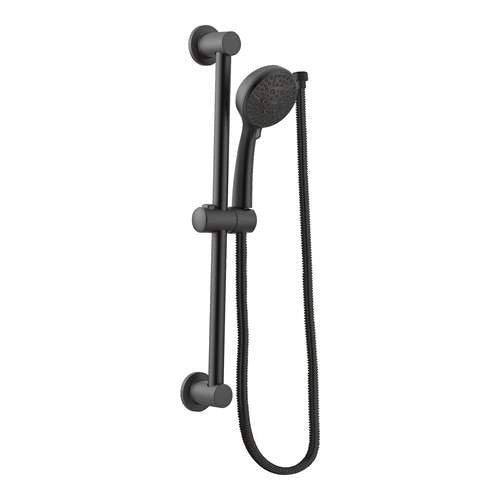 The Moen 3669EPBL is an eco-performance single function hand shower. It features a matte black finish that suits modern bathroom designs. This hand shower comes with a two-inch diameter spray head. It conserves water while maintaining strong performance. The included slide bar allows users to easily adjust the height of the handheld shower. The product meets EPA WaterSense criteria.