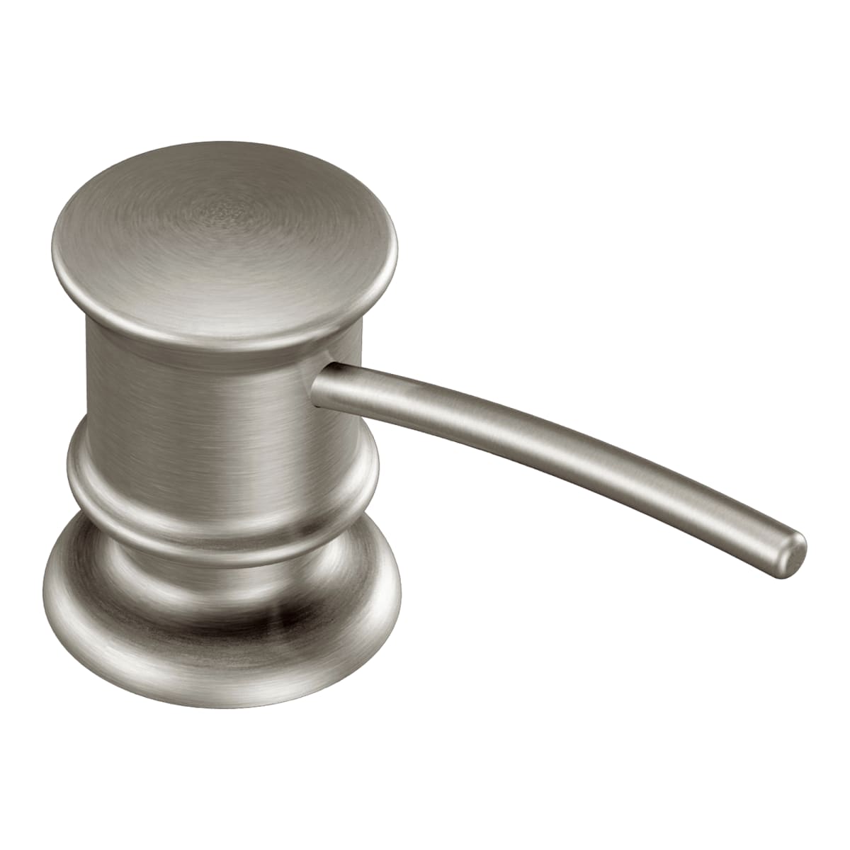 The Moen 3944SRS Soap Dispenser is designed for use in kitchens. This dispenser allows for easy access to soap or lotion. The dispenser includes an eighteen-ounce refillable bottle. It is a top refill, deck mount model that simplifies installation and refilling.