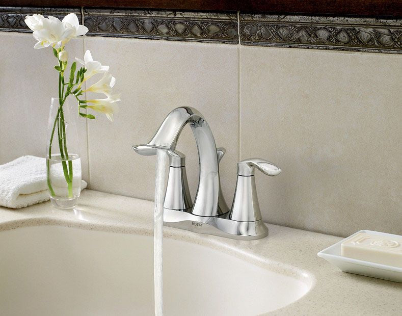 The Moen Eva faucet 6410 features a two-handle design for easy control of water temperature and flow. Designed for centerset installation, this faucet fits conveniently into a standard three-hole sink setup. The chrome finish provides a bright, reflective surface that complements various bathroom styles. With a flow rate of one point five gallons per minute at sixty PSI, it maintains efficiency while meeting EPA WaterSense criteria.