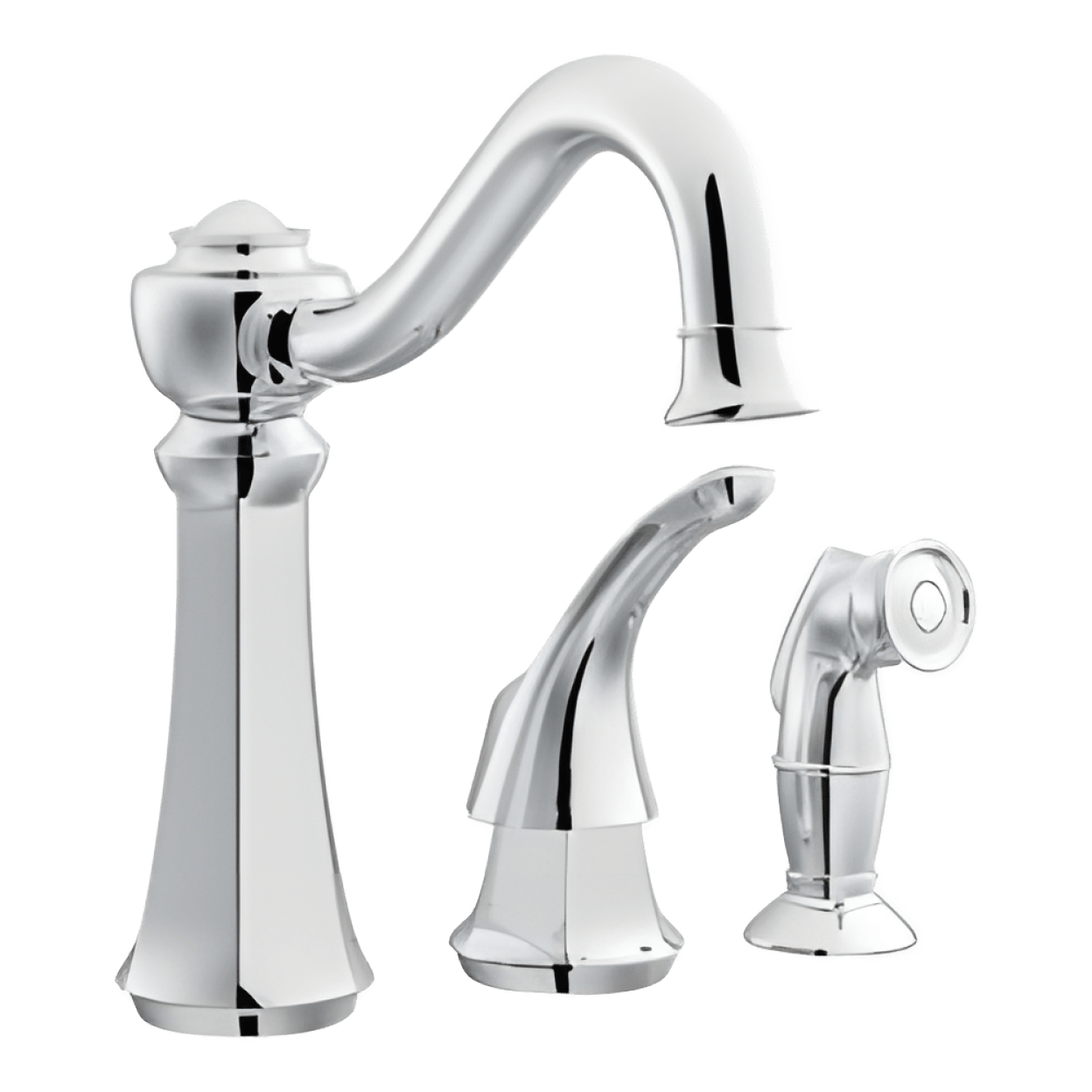 The Moen 67430 is a single-handle kitchen faucet in the Chateau collection. This faucet features a side spray for flexible cleaning around the sink. It is designed for four-hole mount installations, making it suitable for a variety of kitchen configurations.
