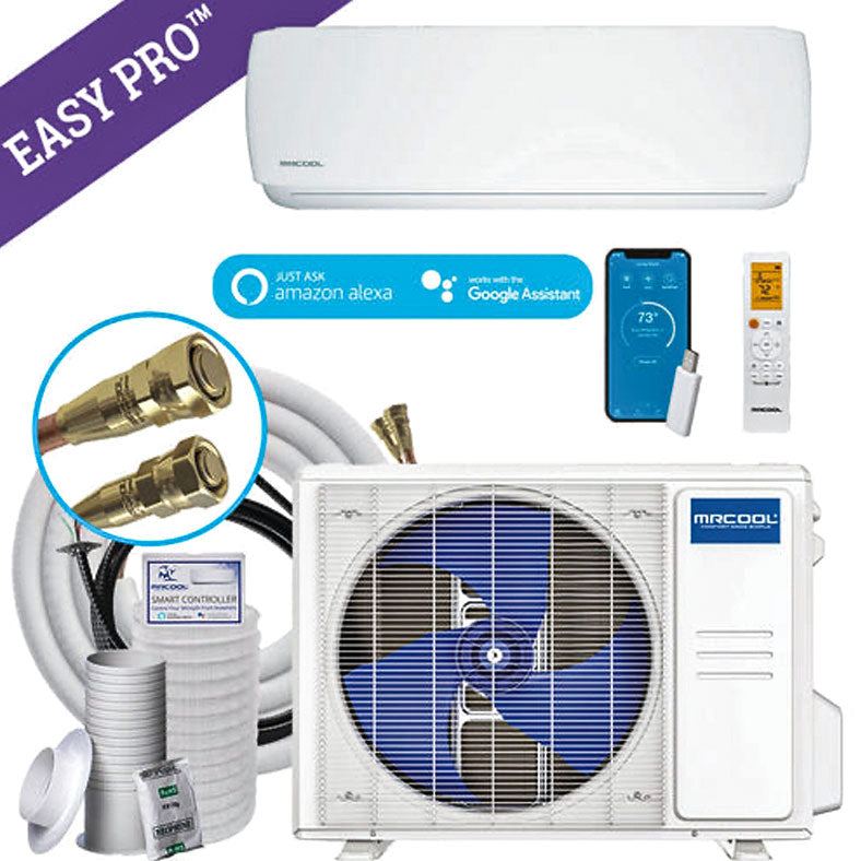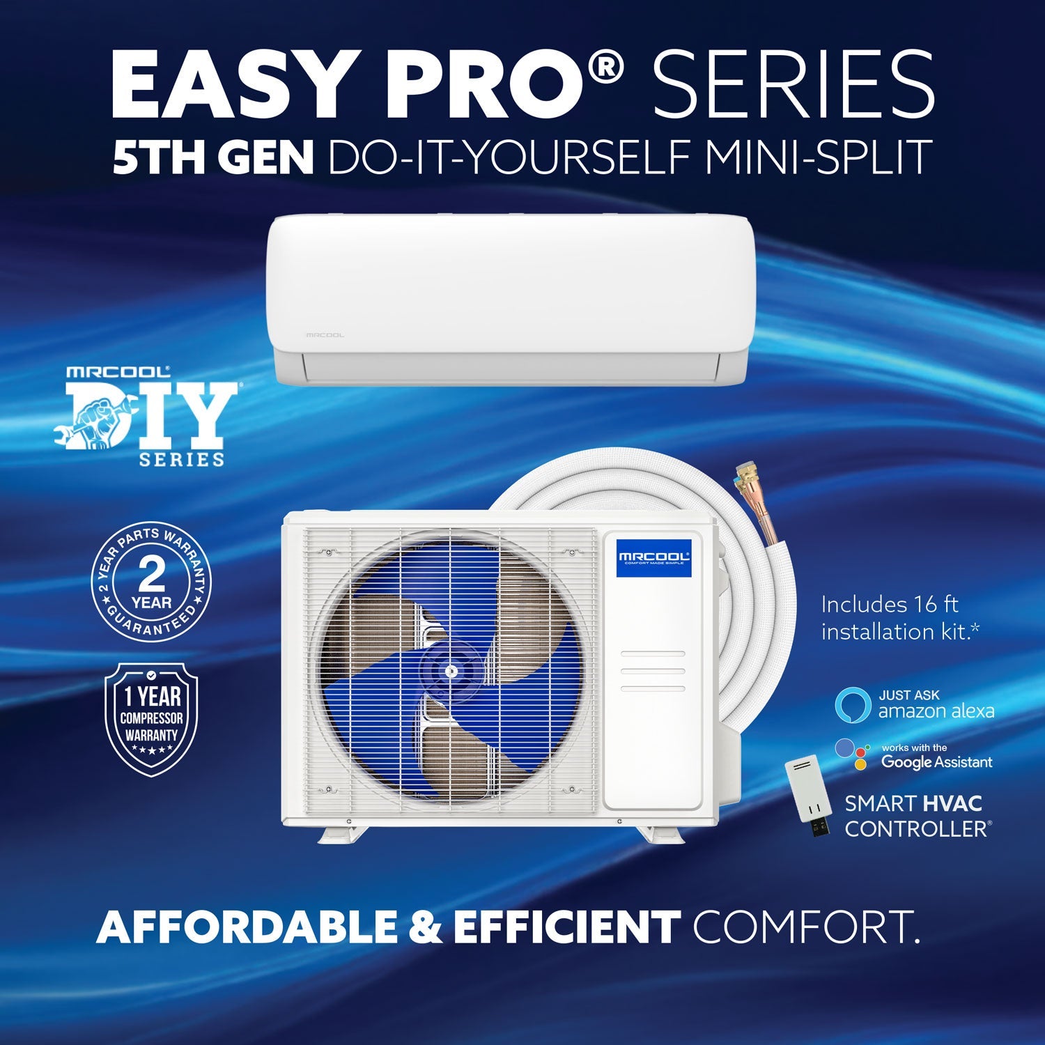 The MRCOOL DIY 5th Generation EasyPro 9,000 BTU Mini Split provides efficient, quiet heating and cooling for areas up to 400 sq. ft. This all-in-one single-zone system includes a pre-charged 16 ft line set with Fast Connection fittings and a rugged DIYPRO cable for easy setup without special tools, training, or permits.