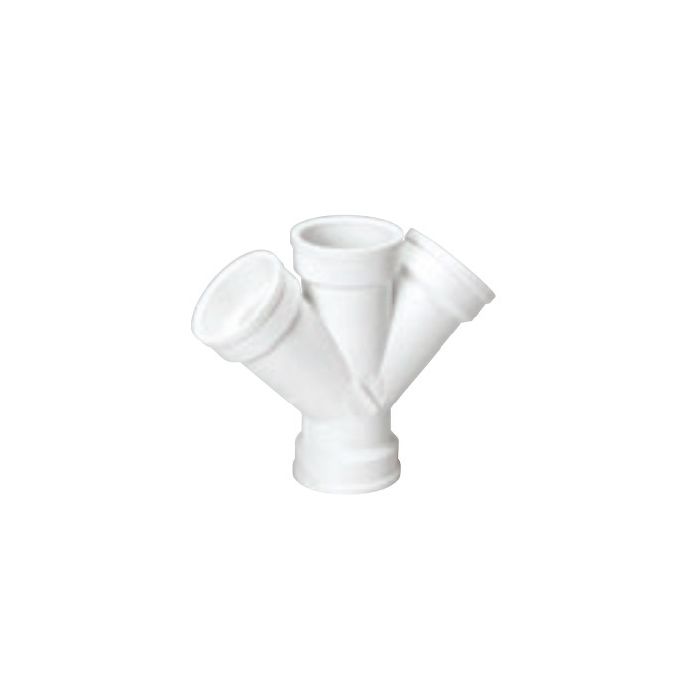 The MUEL 05838 PVC DWV Double Wye is a fitting designed for efficient drainage and venting. It features a hub end style and is made from durable PVC material. This fitting is ideal for connecting three pipes in a drainage system, ensuring smooth flow and resistance to corrosion.