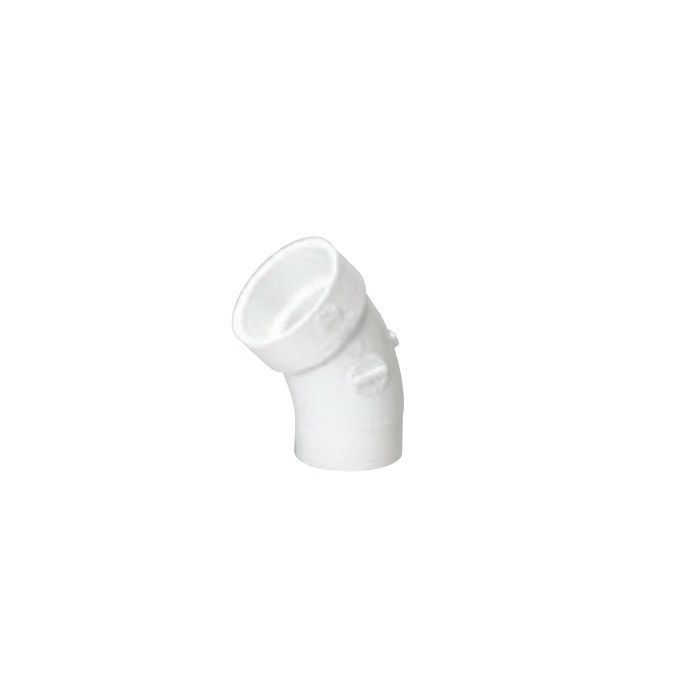 The MUEL 05892 PVC DWV 45 degree street elbow is designed for use in drainage, waste, and vent systems. The fitting features a spigot x hub end style and is made from durable PVC material suitable for SCH 40 standards.