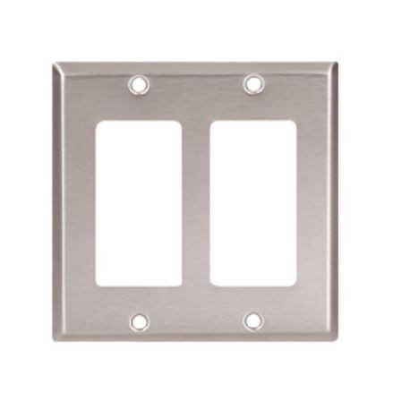The Mulberry 93402 is a standard receptacle wallplate designed for two gangs. This product is made from 302 stainless steel and has a satin finish. It measures four point five inches in height and four point five six two inches in width. The wallplate features two cutouts suitable for block duplex and ground fault circuit interrupter (GFCI) receptacles and has a thickness of zero point zero three five inches.