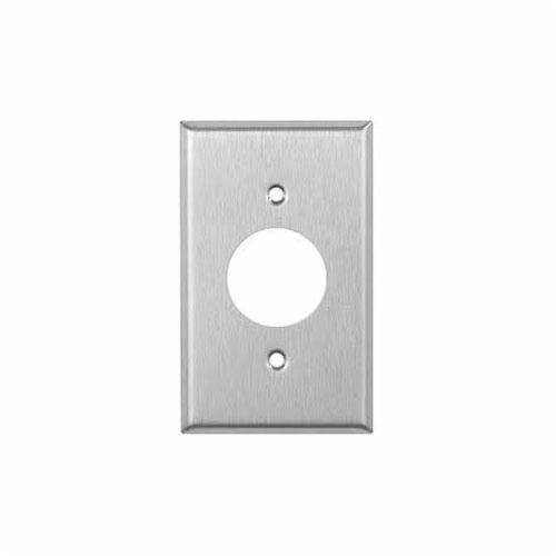 Mulberry Metal Products offers the 97091, a standard receptacle wallplate designed for single gang setups. It is manufactured from 430 stainless steel, providing durability and resistance to corrosion. The dimensions are four and one-half inches in height by two and three-quarters inches in width. This wallplate is designed for vertical orientation and includes a single receptacle cutout.