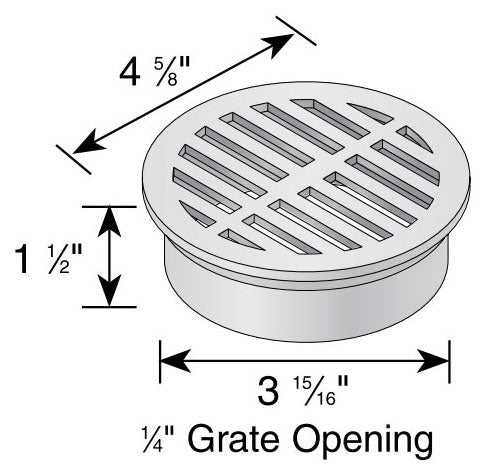 The NDS thirteen is a polypropylene round grate designed for use with four-inch sewer and drain pipes. Its dimensions are four point sixty-three inches by four point sixty-three inches by one and one-half inches. This grate is suitable for various drainage applications, helping to effectively direct water to more suitable areas.