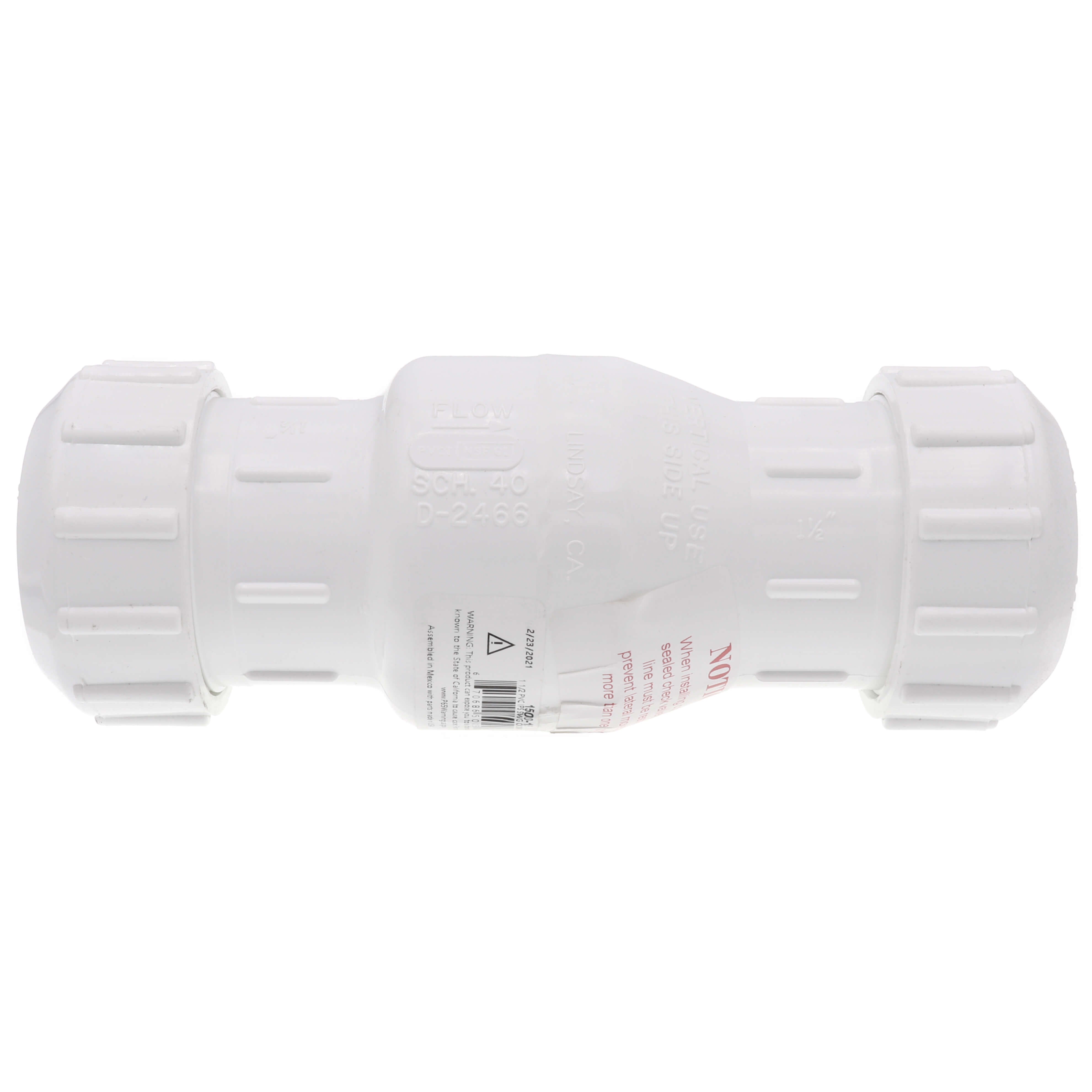 The NDS 1500-15 is a 1-1/2 inch Swing Check Valve made from lead-free white PVC. This valve features a union compression connection on both ends, offering secure attachment in plumbing systems. With a pressure rating of 125 PSI at seventy-two degrees Fahrenheit, it is designed to handle a range of water pressures effectively.