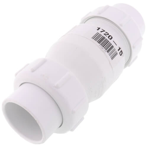 The NDS Series 1700 1-1/2 in. Plastic Union Slip Swing Check Valve, MPN 1720-15, is designed for reliable flow control in various plumbing systems. This valve is made of durable PVC Type I material and meets ASTM-ANSI standards. It features a socket x socket connection and is molded in the USA for quality assurance.