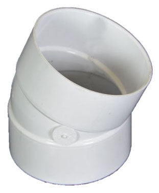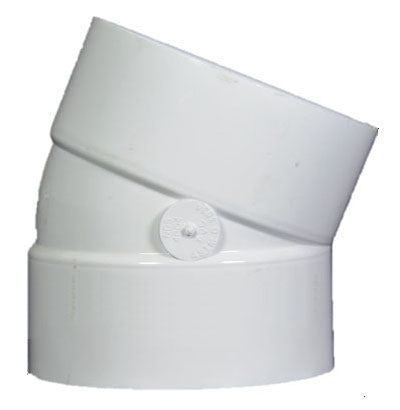 The NDS 6P04 is a six inch hub x hub elbow fitting made from durable PVC. It is designed for street and solvent weld applications in sewer and drainage systems. This elbow has an angle of twenty-two and a half degrees, facilitating directional flow in piping systems.